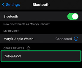 Switch on Bluetooth on your mobile device. On the Bluetooth settings screen, search for Outlier Air V3, and select to pair.
