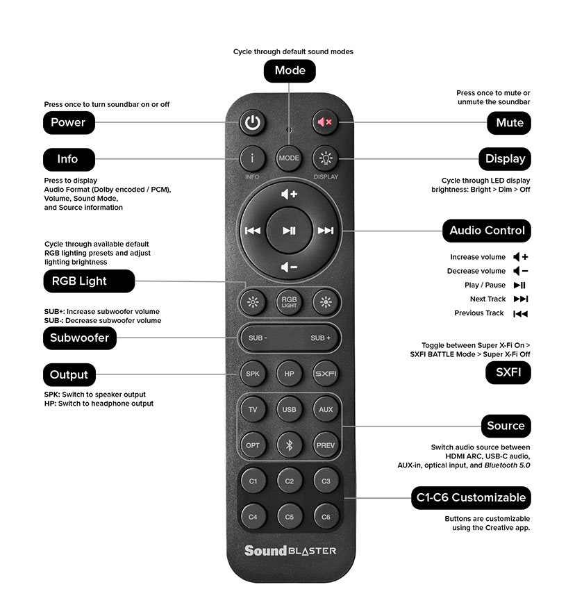 The Sound Blaster Katana V2 comes with a comprehensive remote control that allows you to access all the settings you need. Besides the basic audio controls, you can also change audio source, switch RGB lighting presets, or access a custom function saved on one of the six customizable buttons!
