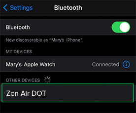 Switch on Bluetooth on your mobile device. On the Bluetooth settings screen, search for Zen Air DOT, and select to pair.