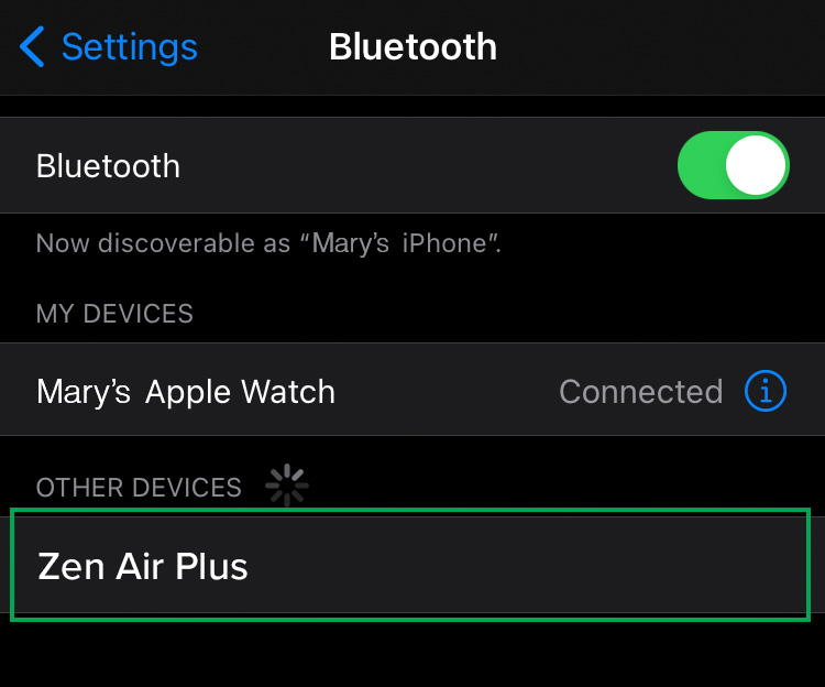 Switch on Bluetooth on your mobile device. On the Bluetooth settings screen, search for Zen Air Plus, and select to pair.