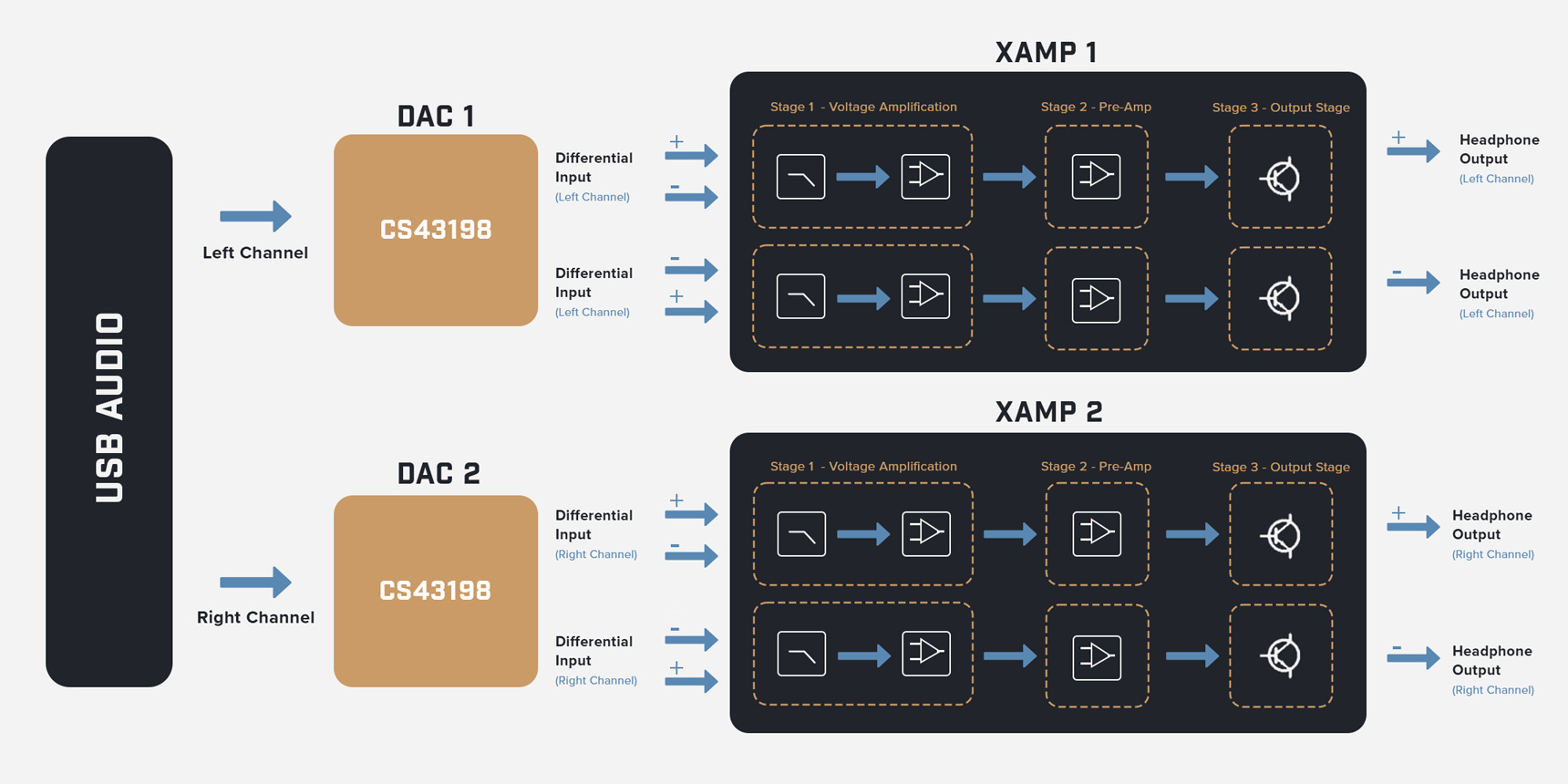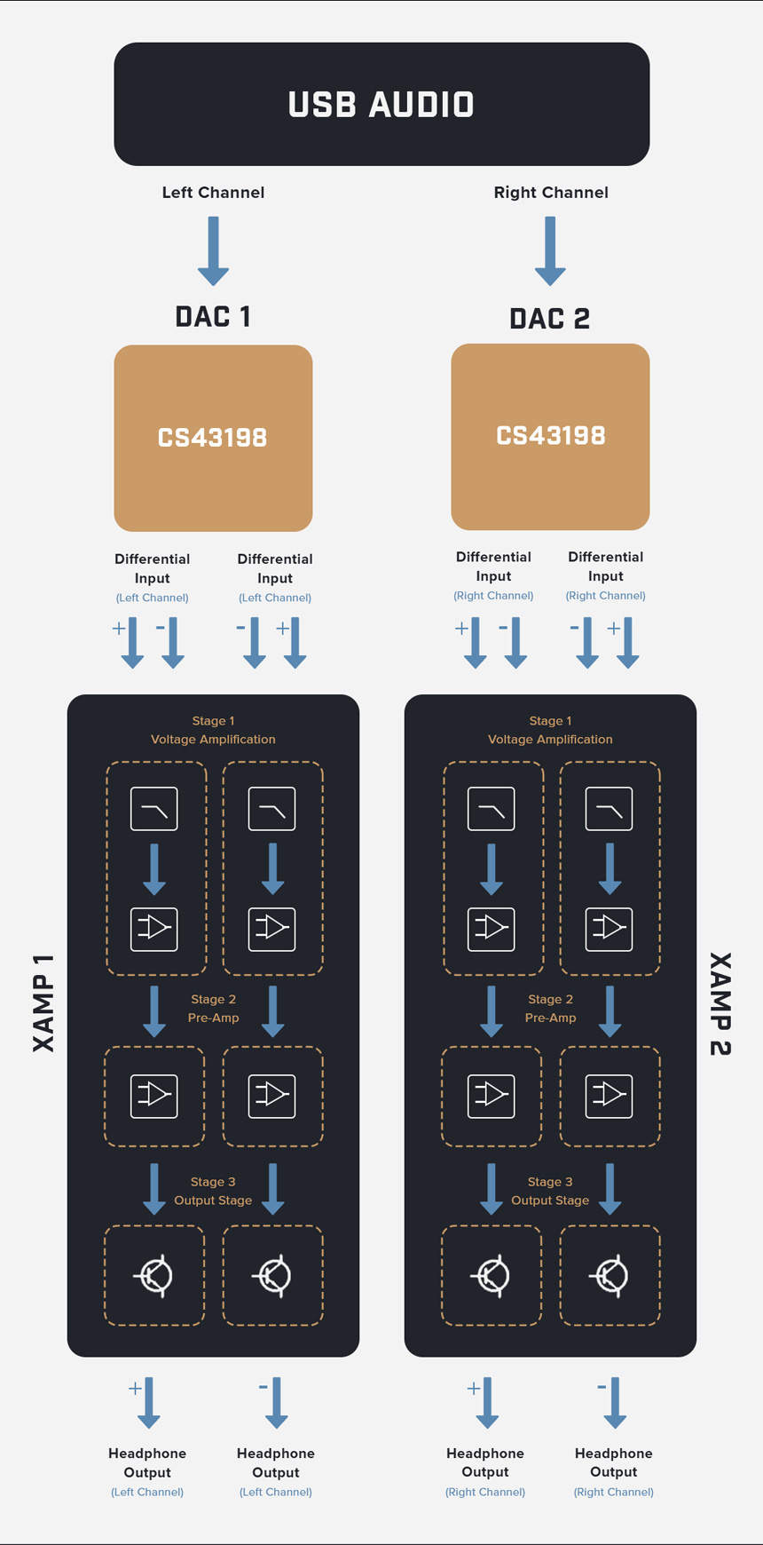 In a gist, the external USB sound card fires up to 32-bit / 384 kHz PCM playback at 130 dB DNR, and features dual Cirrus Logic CS43198 DACs, our custom-designed, fully balanced Xamp headphone bi-amplifier, and customizable DSP EQ functions.